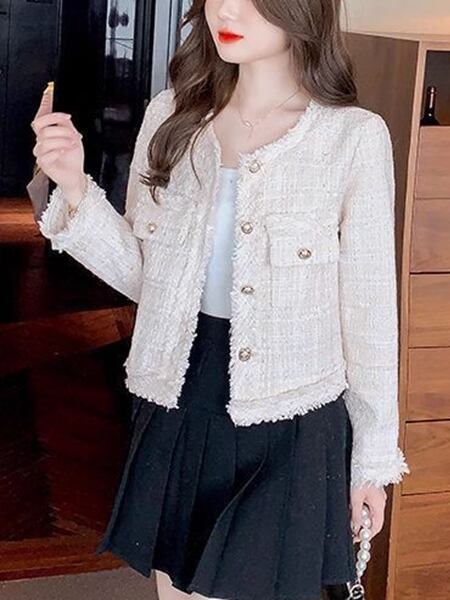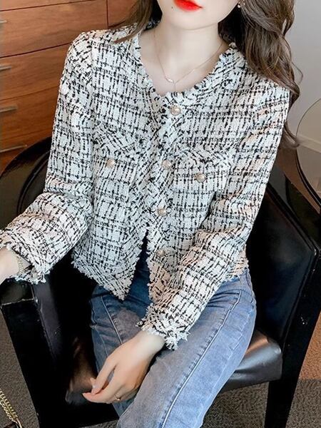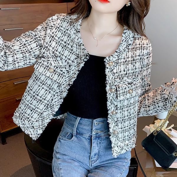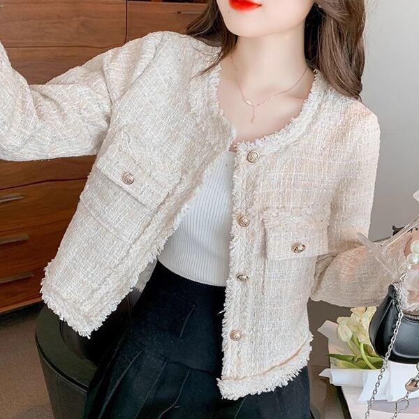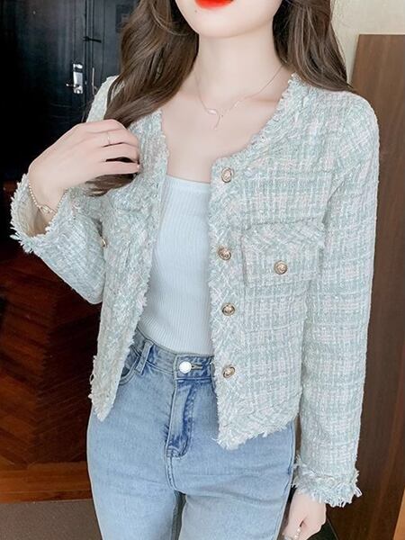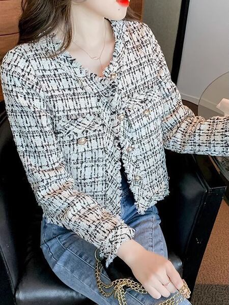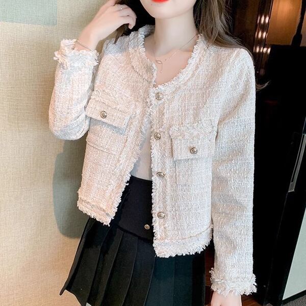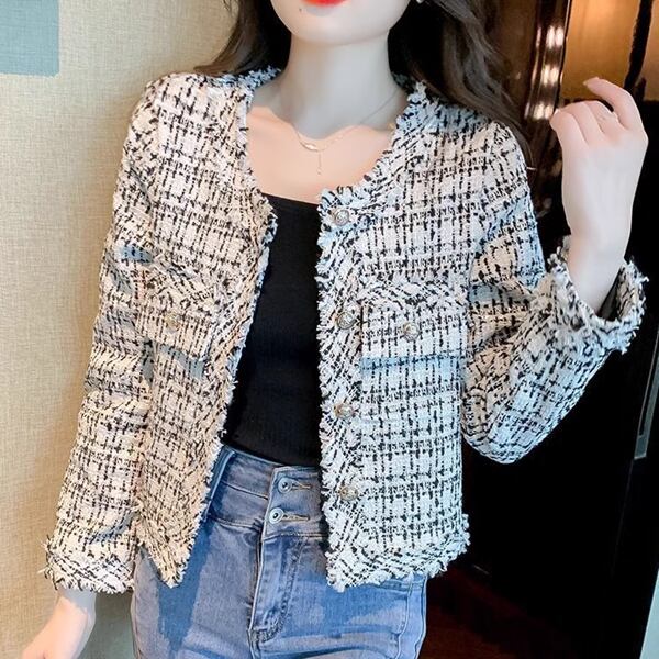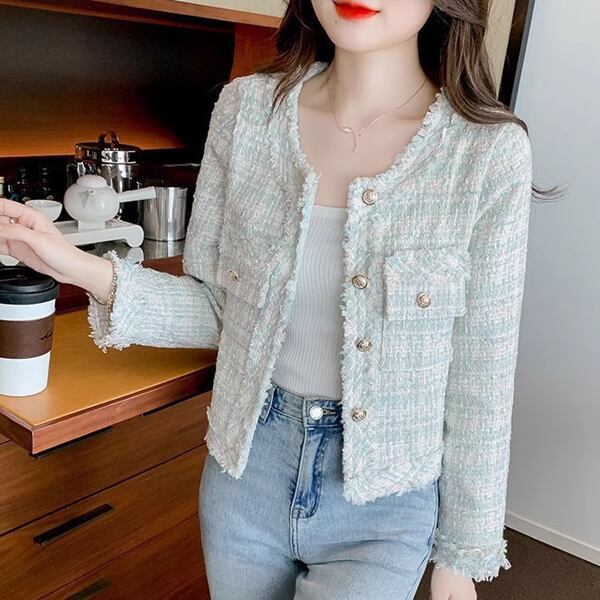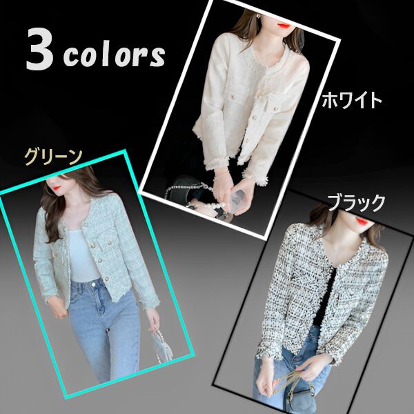3色展開 レディース トップス ジャケット アウター 上着 テーラードジャケット ブレザー クロップド丈 長袖 ラウンドネック Aライン スリムフィット ポケット ボタンステッチ ツイード ボタン フリンジ 前開き 厚手 大人可愛い カジュアル 上品 おしゃれ モード系 エレガント フォーマル 知的 オフィスカジュアル 格子柄 春 秋 冬 20代 30代 オフィス 通勤 イベント レストラン ガーデン ショッピング コンパ 着回し