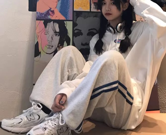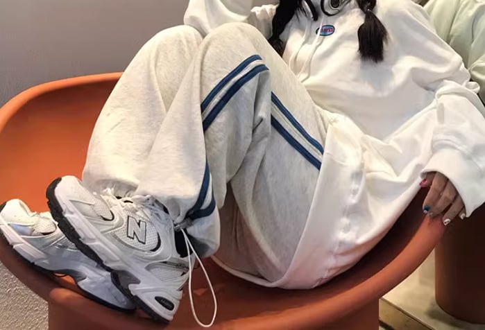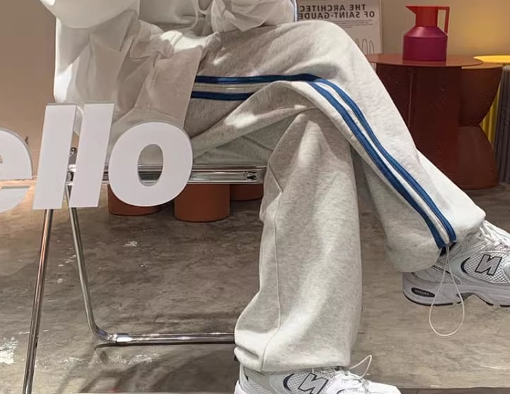 グレー×ブルーのシックな色使いが大人っぽいフルレングスのスウェットパンツ。