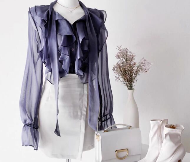 レディース トップス シャツ ブラウス ミドル丈 長袖 ベルスリーブ トランペットスリーブ フェミニン シフォン フリル リボン 前開き 透け感 シースルー 異国風 ボタン かわいい 大人可愛い きれいめ シンプル 上品 おしゃれ こなれ感 ガーリー エレガント 無地 春 夏 オフィス ビジネス OL 通勤 デート お出かけ 韓国 体型カバー 普段使い 着回し 日焼け防止 日焼け対策 S M L XL 大きいサイズ ホワイト ブラック グレー