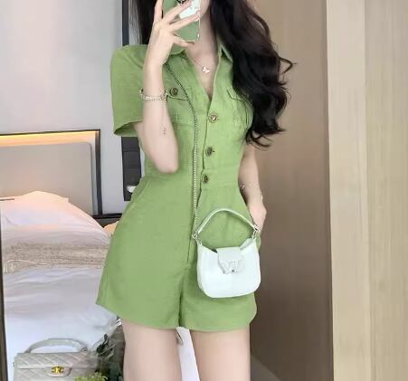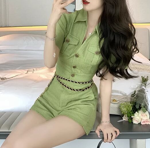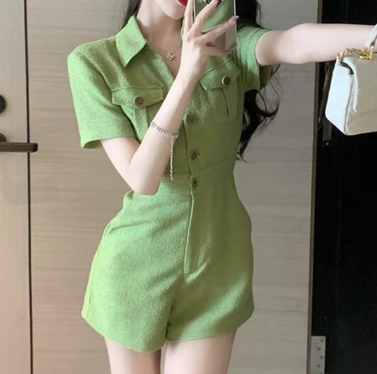 レディース オールインワン ミニ ショート 半袖 Vネック 襟付き ポロカラー ポケット ハイウエスト ボタン ツイード かわいい 大人可愛い きれいめ シンプル カジュアル 上品 おしゃれ かっこいい レトロ こなれ感 ボーイッシュ クール エレガント キュート ラグジュアリー セクシー ハンサム シック 高級感 無地 夏 10代 20代 学生 デート お出かけ 普段使い S M L XL 大きいサイズ グリーン