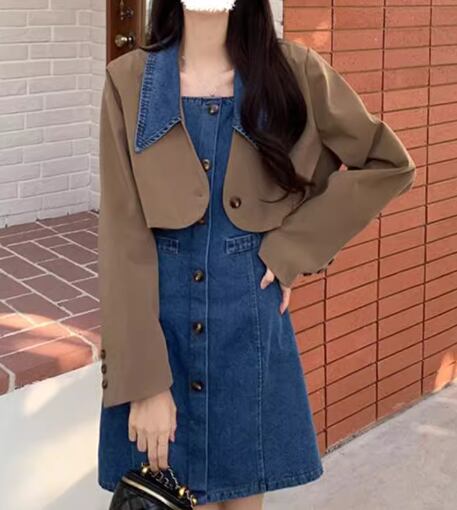 二点セット ツーピース レディース ジャケット ワンピース セットアップ 羽織 前開き デニムワンピース ミニ ショート クロップド丈 袖なし ノースリーブ 長袖 襟付き ドッキング フェミニン 異国風 ボタン かわいい 大人可愛い きれいめ シンプル カジュアル おしゃれ かっこいい レトロ 無地 春 10代 20代 学生 デート お出かけ 重ね着 普段使い 着回し レイヤード M L XL 大きいサイズ ブラック カーキ