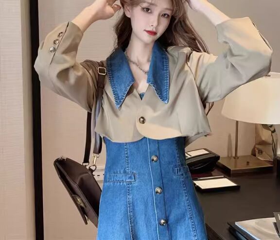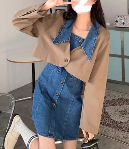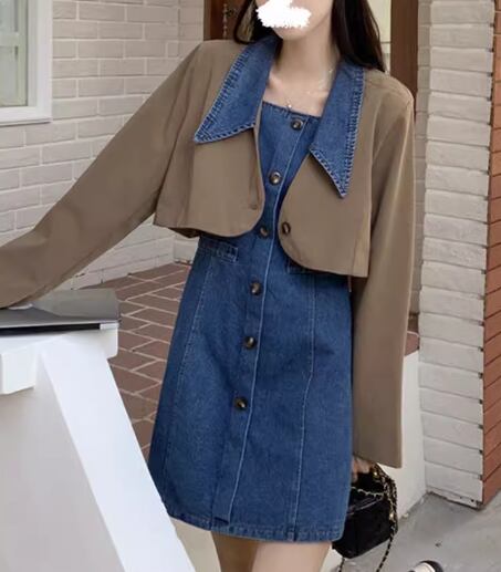 クロップド丈の長袖ジャケットとショート丈のノースリーブデニムワンピースの二点セットです。