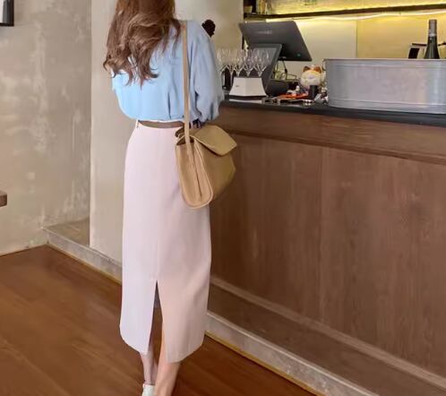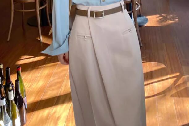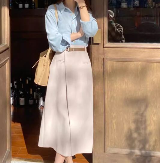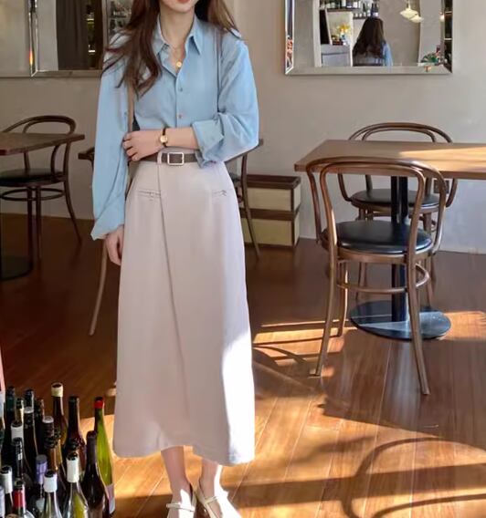 爽やかなブルーの長袖シャツとミモレ丈のオフホワイトのスカートの二点セットです。