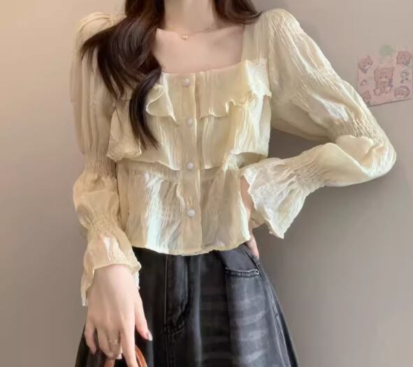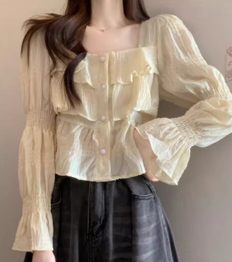 レディース トップス シャツ カットソー プルオーバー ショート クロップド丈 長袖 ベルスリーブ スクエアネック スリム 細身 フェミニン フリル 異国風 ボタン 薄手 かわいい 大人可愛い きれいめ シンプル 上品 おしゃれ レトロ ガーリー エレガント キュート 豪華 シック 高級感 華やか 無地 春 夏 デート お出かけ 普段使い 着回し フリーサイズ 小さめ ホワイト ブラック アプリコット