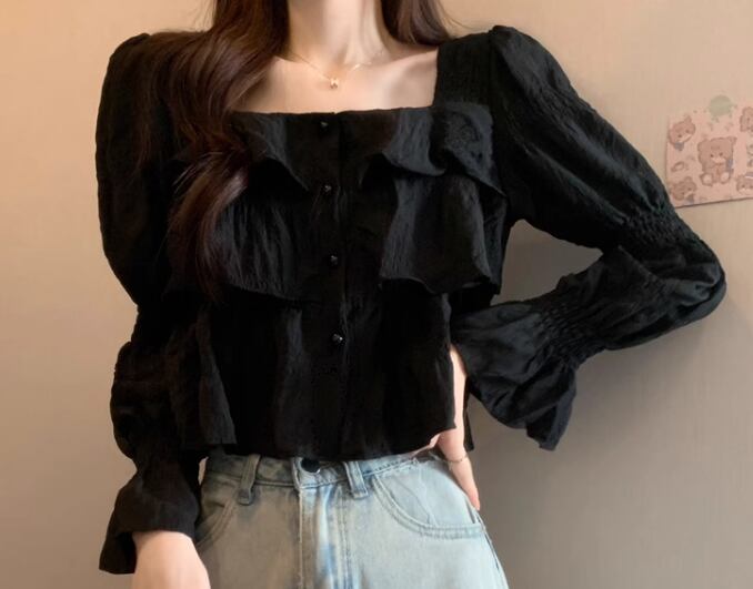 シックなカラー×フリルたっぷりのガーリーなデザインが大人可愛い長袖のショート丈トップス。