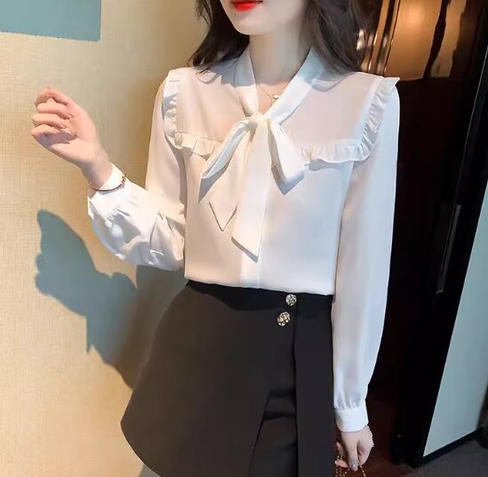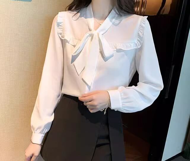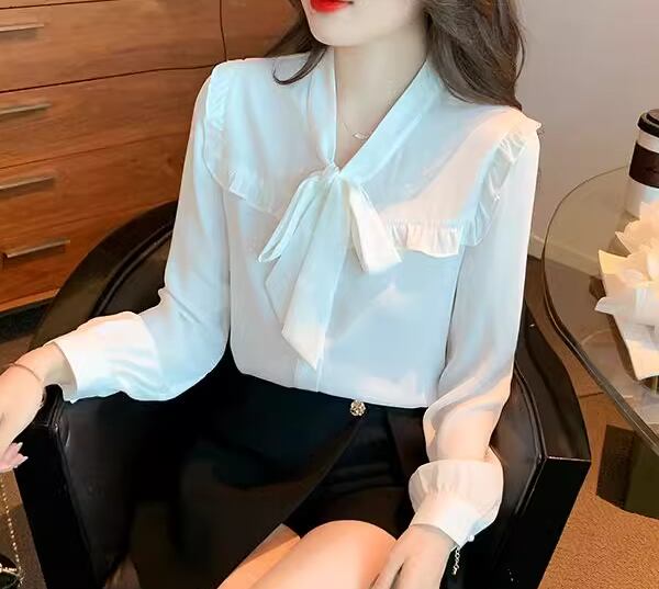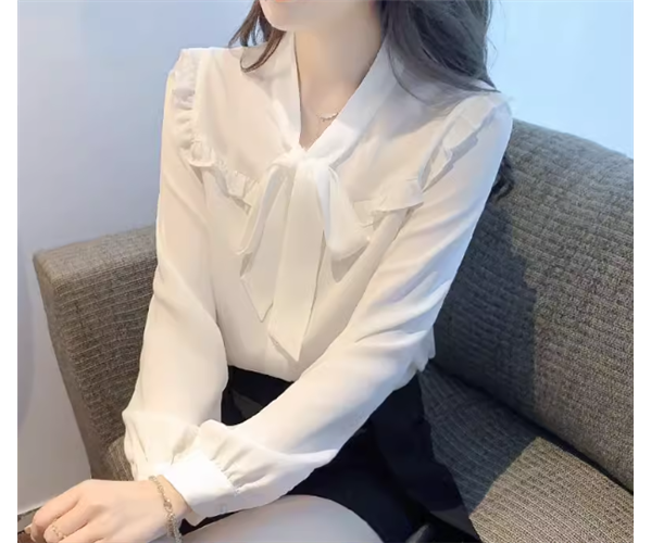 上品でエレガントなデザインが魅力的な長袖のシフォンシャツ。