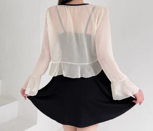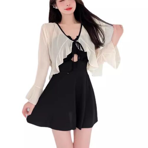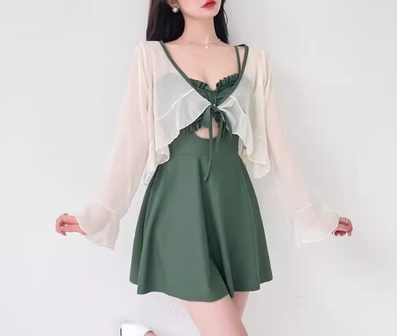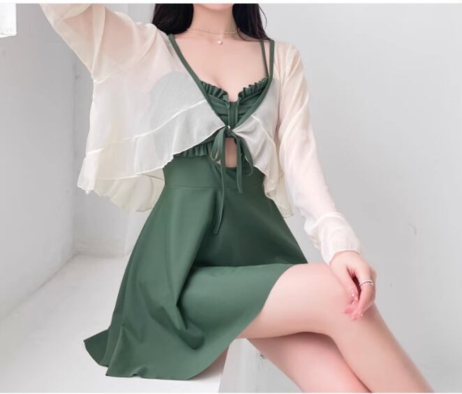 水着 レディース 重ね着 レイヤード ワンピース 体型カバー スカートスタイル セパレート ノンワイヤー パッド付き 長袖 リボン フリル セット ツーピース 二点セット かわいい 大人可愛い きれいめ シンプル カジュアル 大人っぽい おしゃれ お洒落 キュート ガーリー 無地 リゾート 旅行 温泉 プール 夏 海 着痩せ 高見え モテ 日除け スタイルカバー お腹カバー 日焼け防止 日焼け対策 S M L XL Aカップ Bカップ Cカップ ブラック イエロー グリーン