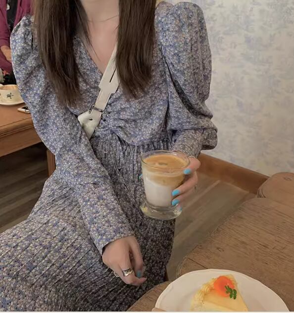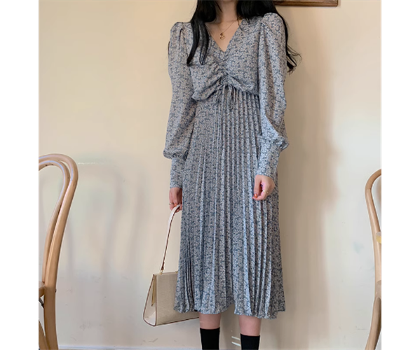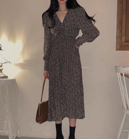 レディース ワンピース プルオーバー 膝上 ミモレ ロング 長袖 Vネック Aライン フェミニン プリーツ ウエストマーク 異国風 かわいい 大人可愛い きれいめ 上品 おしゃれ レトロ ガーリー エレガント キュート シック 高級感 優しい 穏やか フェアリー 森ガール 花柄 フラワー プリント 小花柄 春 秋 普段使い モテ 清楚 S M L XL 大きいサイズ ブラック ブルー