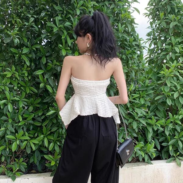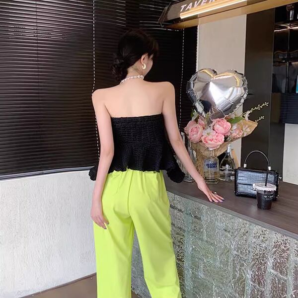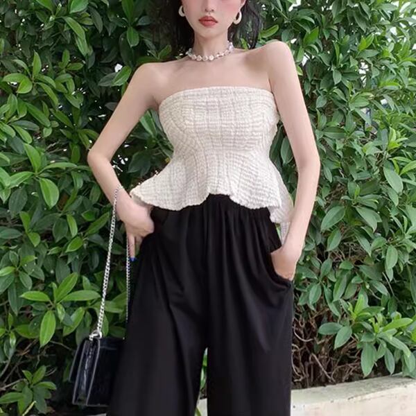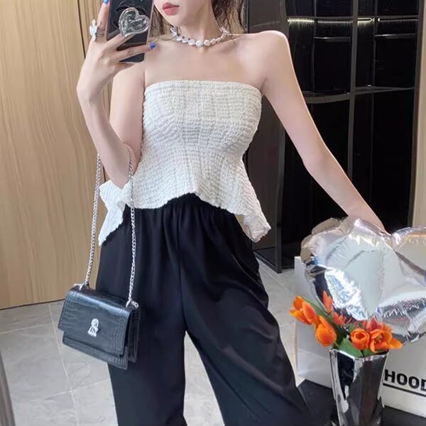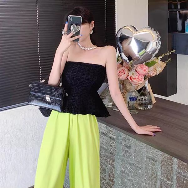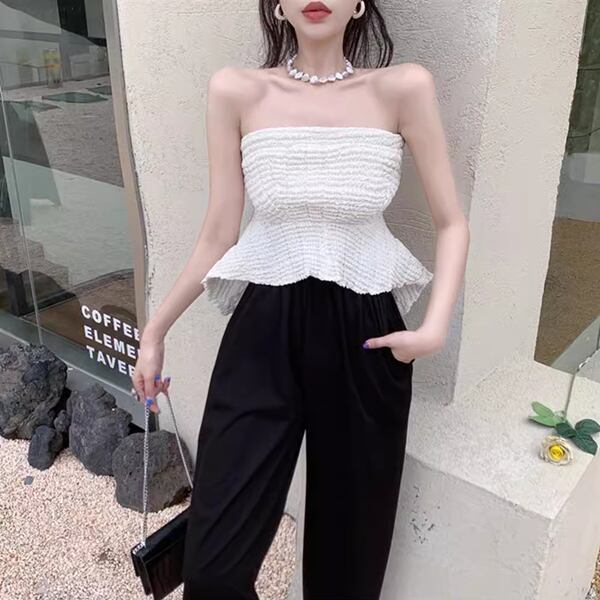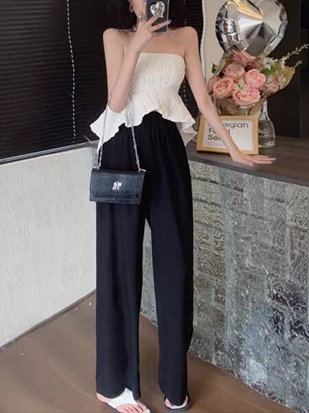チューブトップとワイドパンツのセット。トレンド感満載!ノースリーブのチューブトップはクロップド丈。涼しさが肩を美しく見せ、まさにセクシーなホットガールのベビードールトップ。それにゆったりしたストレートワイドパンツをあわせて夏のカジュアルコーデの完成です。涼しさとスタイルを両立させた貴女をサマーステージが待っていますヨ!