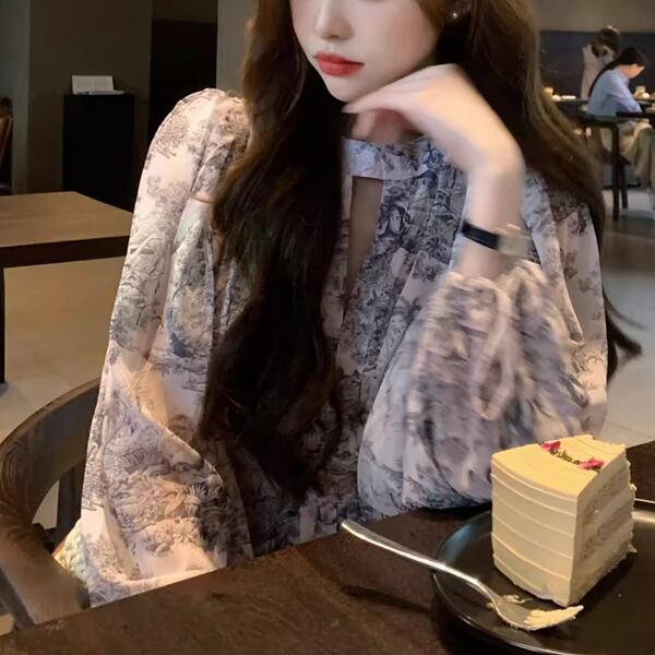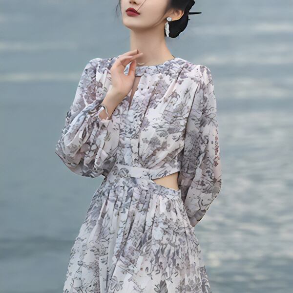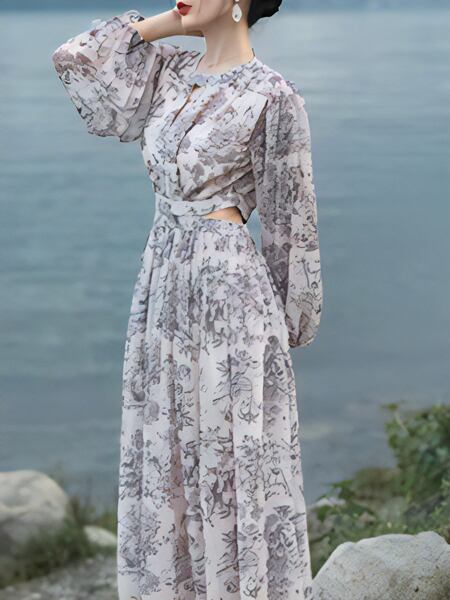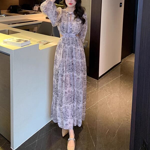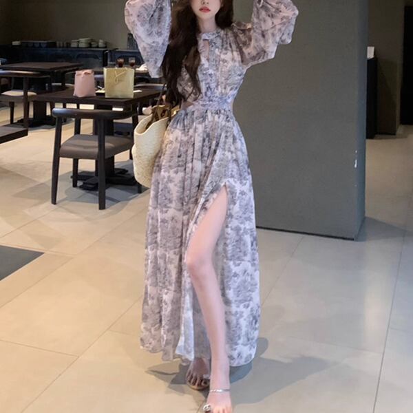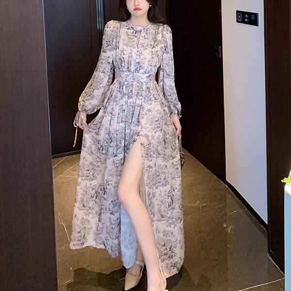 ティーブレイク花柄シフォンドレスレディース ワンピース ドレス ロング ボヘミアン 長袖 ランタンスリーブ ラウンドネック フレア Aライン ハイウエスト フォーマル フェミニン シフォン スリット ジッパー バイカラー 大人可愛い カジュアル 上品 おしゃれ レトロ エレガント モダン フォーマル キュート プリンセス セクシー 花柄 プリント 20代 30代 お出かけ リゾートスタイル パーティー イベント レストラン ホテル コンサート