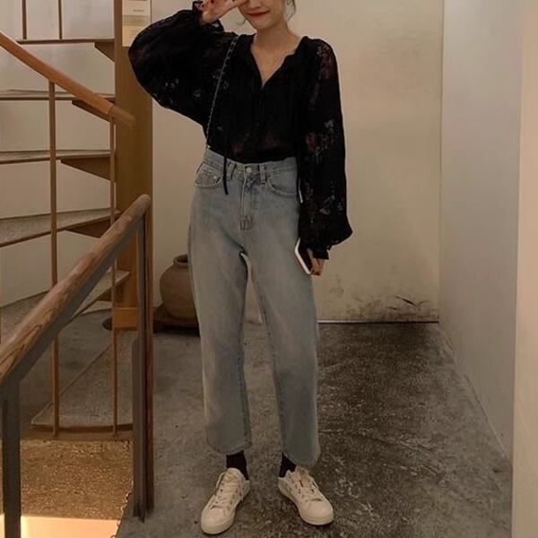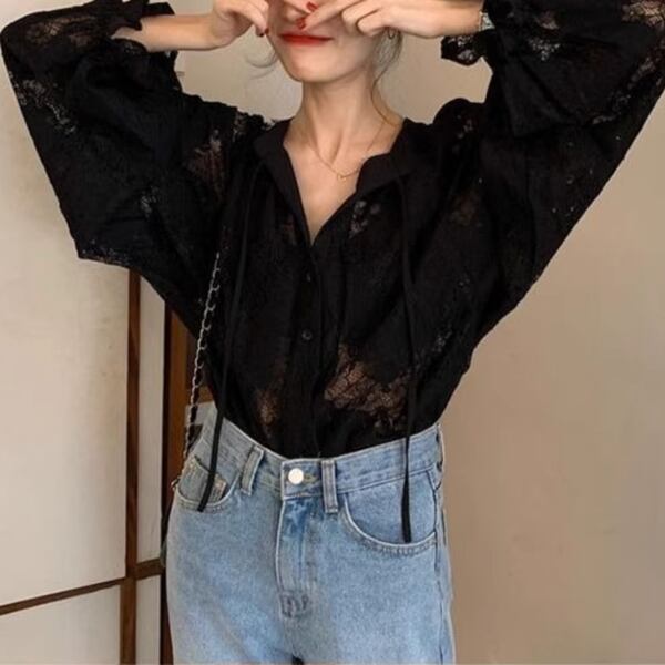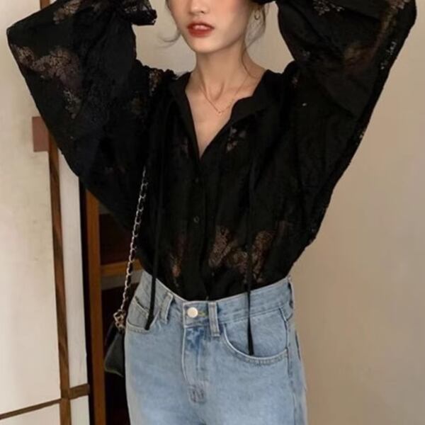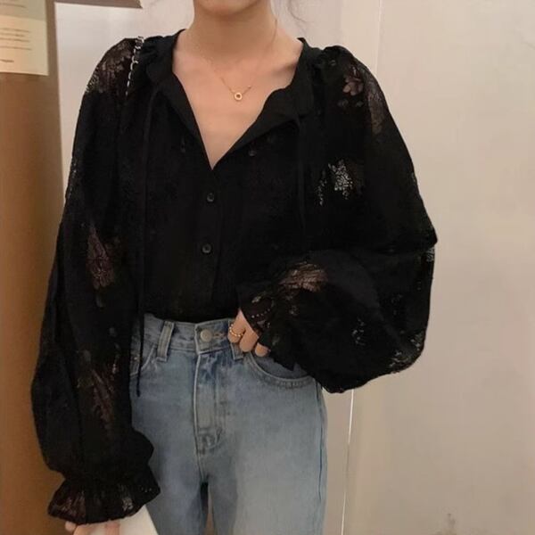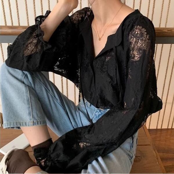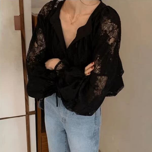 Vネック、長袖ランタンスリーブのレースシャツは、エレガントで女性らしいデザインが特徴。繊細なレース素材とゆったりとした袖が、華やかさと着心地の良さを両立。カジュアルにもフォーマルにも合わせやすい一枚です。