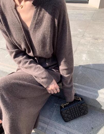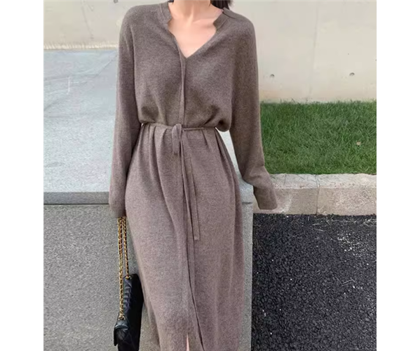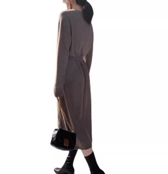 上品で落ち着いた色味とシンプルで洗練されたデザインが大人可愛い長袖のミモレ丈ニットワンピース。