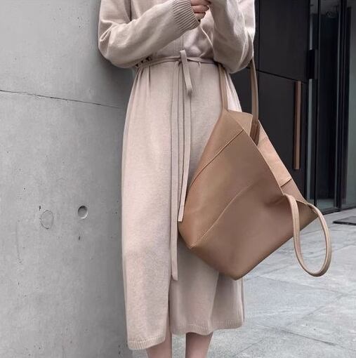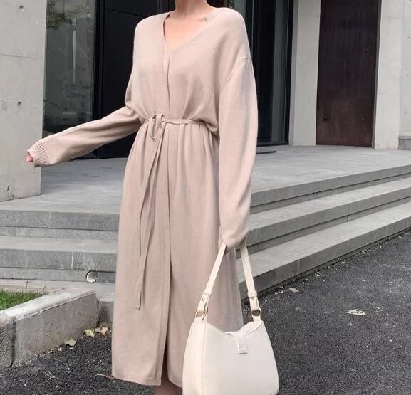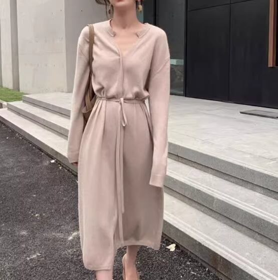 レディース ワンピース プルオーバー ニットワンピ ミモレ ロング 長袖 Vネック Aライン ウエストマーク ハイウエスト かわいい 大人可愛い きれいめ シンプル カジュアル 上品 おしゃれ レトロ ルーズ クール エレガント キュート ナチュラル シック 高級感 優しい 穏やか 無地 秋 冬 デート お出かけ 体型カバー 普段使い S M L XL 大きいサイズ ゆったり ブラウン グレー