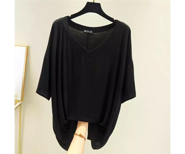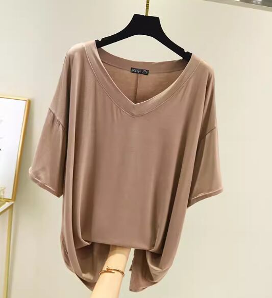 上品で落ち着いた色味とゆったりシルエットが魅力的なVネックの半袖Tシャツ。