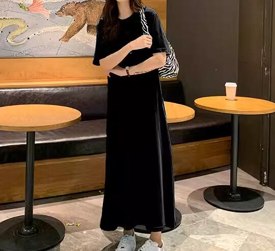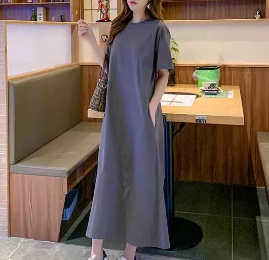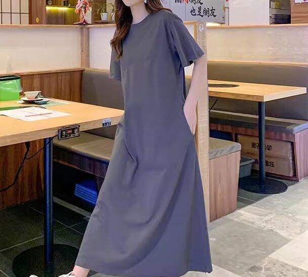 Tシャツ風のシンプルなデザインが魅力的なロング丈の半袖ワンピース。