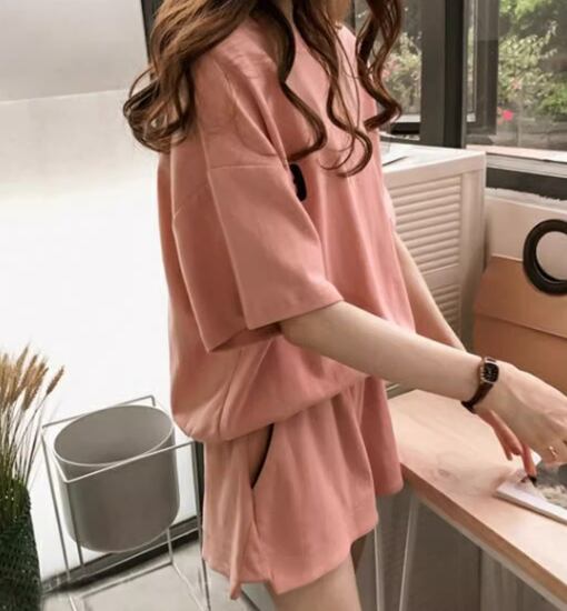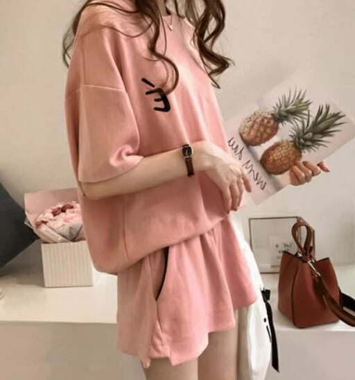 半袖のミドル丈Tシャツとショートパンツの二点セットです。