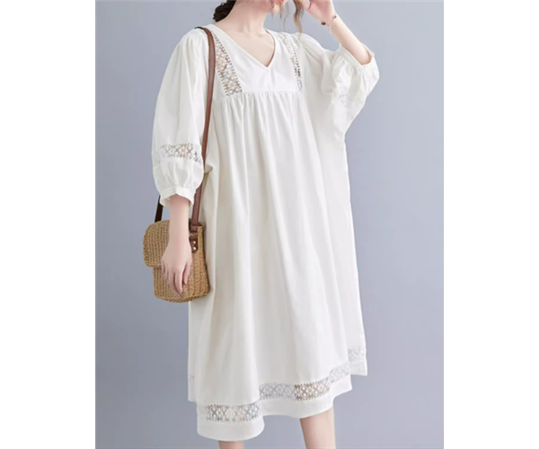ゆったりとしたシルエットと上品で大人可愛いデザインが魅力的な五分袖の膝丈ワンピース。
