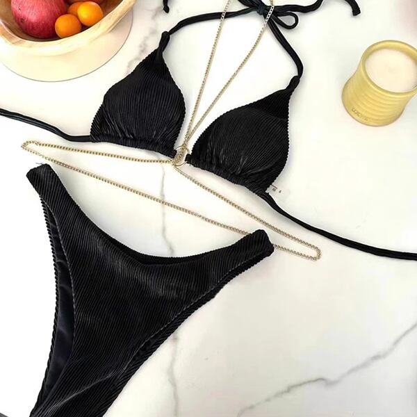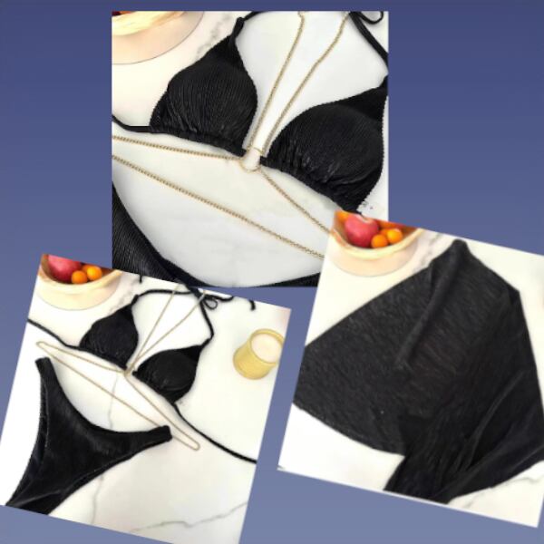 背中の開いた黒のチェーンビキニ、パレオ付きの三点セットです。セクシーでエレガントなデザイン。チェーンディテールとシックな黒色がスタイリッシュ。そして、パレオを着ければビーチやプールサイドでのスタイルが完成。砂、風、波の風景を背に、最高の“画”になるアイテムです。