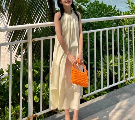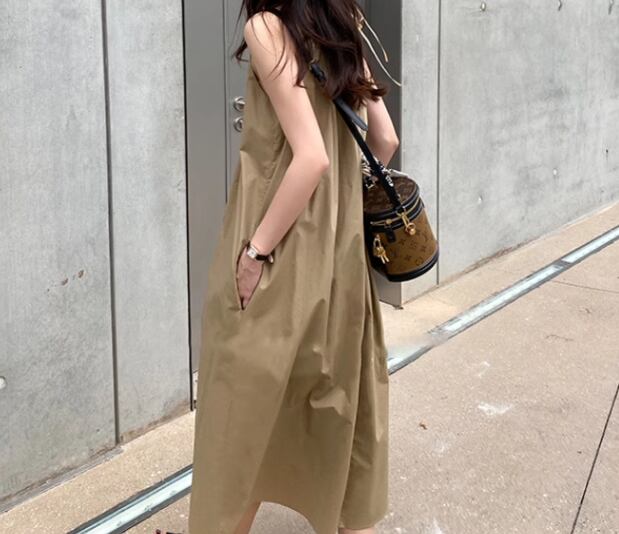 レディース ワンピース プルオーバー ミモレ ロング 袖なし ノースリーブ ラウンドネック ホルターネック Aライン プリーツ ポケット 異国風 かわいい 大人可愛い きれいめ シンプル カジュアル レトロ ラフ ガーリー ルーズ エレガント キュート ナチュラル 無地 夏 デート お出かけ 楽ちん 体型カバー 普段使い 清楚 定番 フリーサイズ ゆったりウエスト ブラウン オフホワイト ネイビー