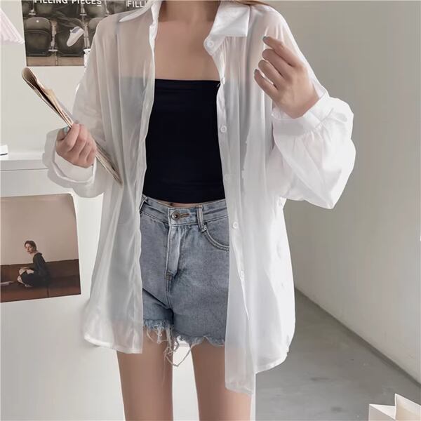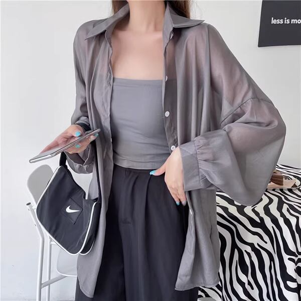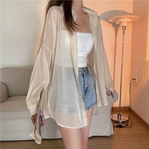 4色展開 アイスシルク長袖日焼け止め 薄いカジュアルシャツ 夏スタイル レディース トップス シャツ ブラウス ロング 長袖 ランタンスリーブ ポロカラー ストレート 前開き 透け感 ボタン 薄手 かわいい 大人可愛い カジュアル 上品 かっこいい レトロ ルーズ エレガント 爽やか 涼しげ 無地 夏 10代 20代 オフィス 通勤 イベント レストラン ライブ コンパ カフェ 着回し 日焼け防止 日焼け対策 涼しい
