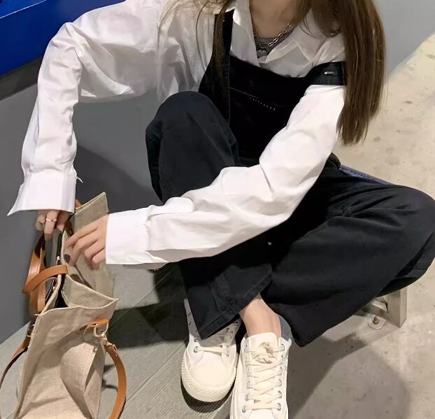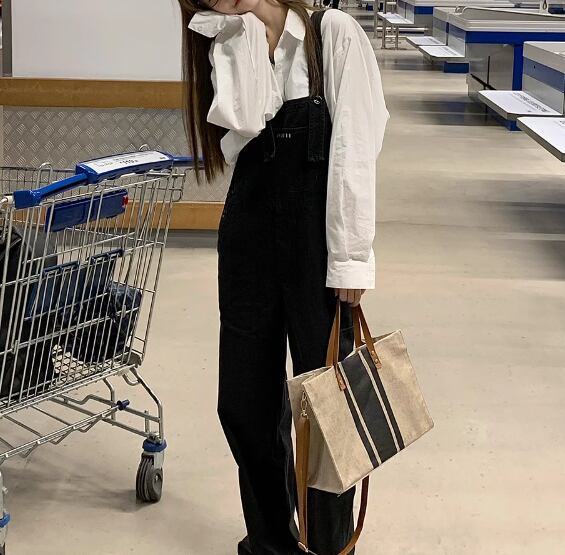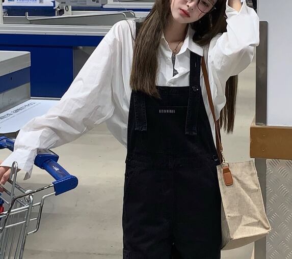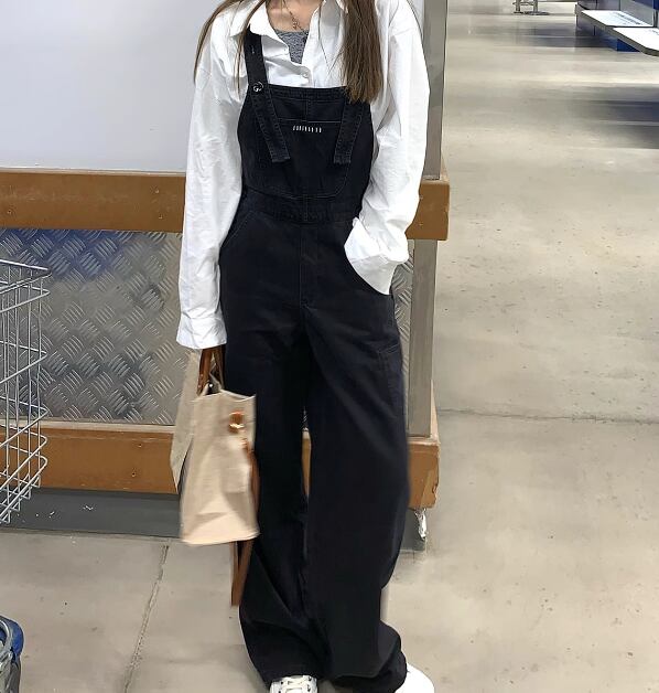 ベーシックでシンプルなデザインが魅力的な黒のオーバーオール。