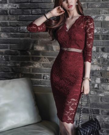 レディース ドレス ワンピース ナイトドレス キャバドレス ミニ ショート 七分袖 Vネック タイト スリム 細身 レース ウエストマーク 透け感 かぎ針編み 透かし編み 可愛い きれいめ 大人可愛い おしゃれ かっこいい エレガント 抜け感 ゴージャス セクシー シック 華やか ラグジュアリー 高級感 フェミニン パーティー イベント レストラン デート 食事会 会食 韓国 高見え 春 秋 S M L XL フィット グリーン レッド