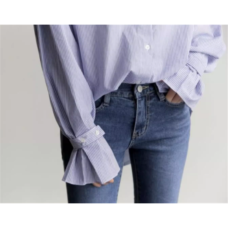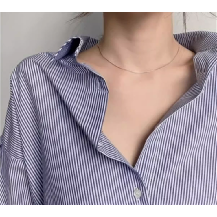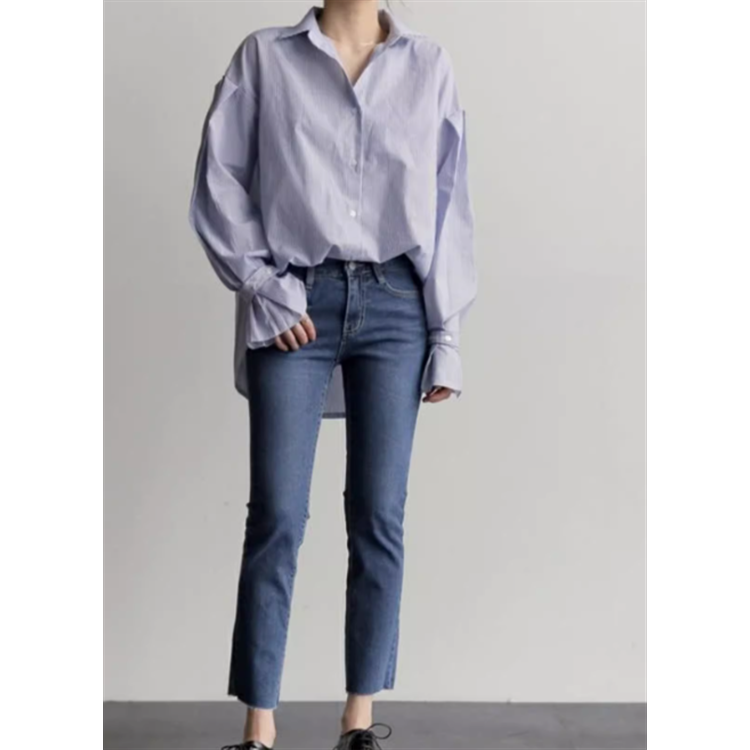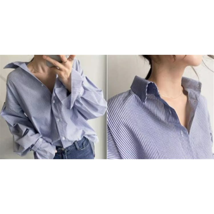 ブルーストライプが爽やかなアシンメトリーデザインのブラウスです。