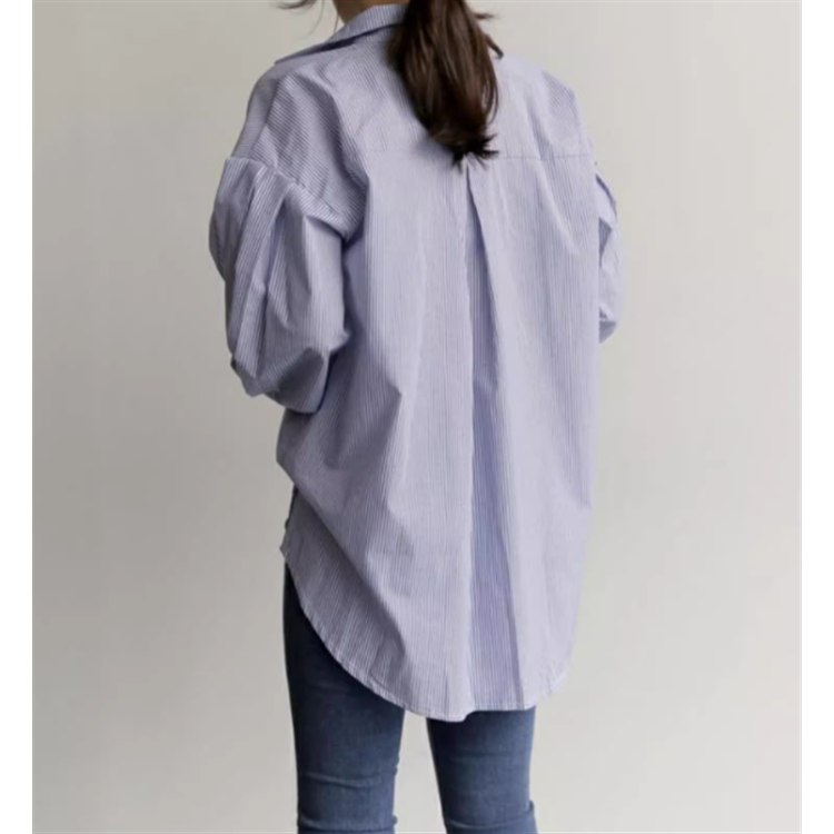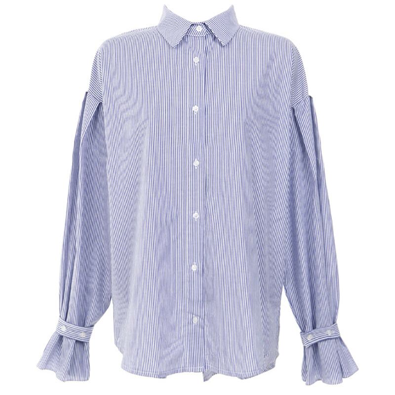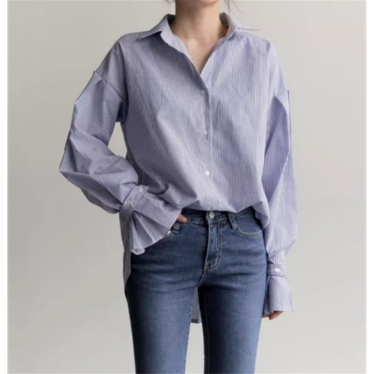 レディース トップス ブラウス 前開き アシンメトリー 長袖 萌袖 ランタンスリーブ ポロカラー タック フリル ボタン コットン おしゃれ 個性的 主役級 存在感 ストライプ 春 秋 冬 オフィス 通勤 S M L XL ゆったり ゆる バイカラー