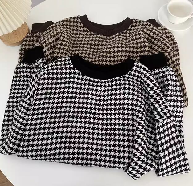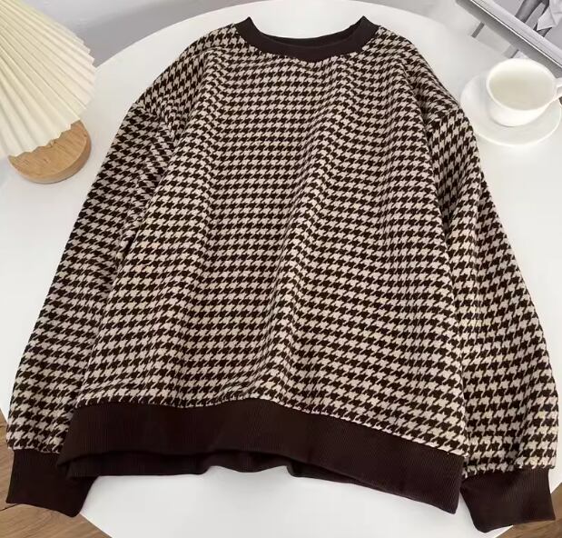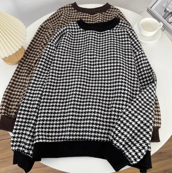 レディース トップス プルオーバー トレーナー スウェット ミドル丈 長袖 ドロップショルダー ラウンドネック 厚手 かわいい 大人可愛い きれいめ カジュアル 上品 おしゃれ かっこいい レトロ ボーイッシュ ルーズ クール エレガント ラグジュアリー 千鳥格子 春 秋 デート お出かけ 体型カバー 普段使い 着回し トレンド 流行 ゆったり ゆる フリーサイズ 大きめ オーバーサイズ ブラック ブラウン