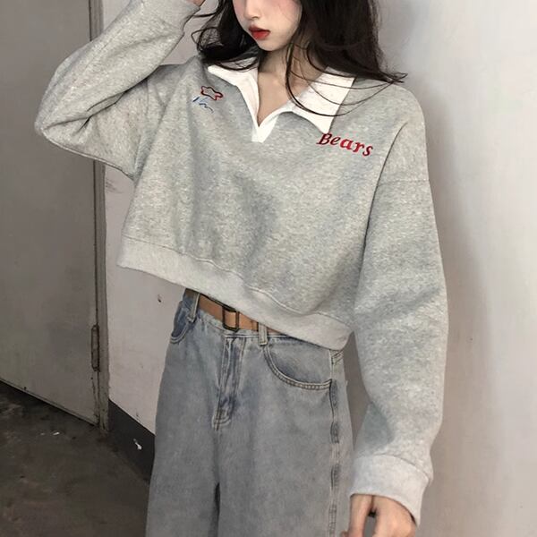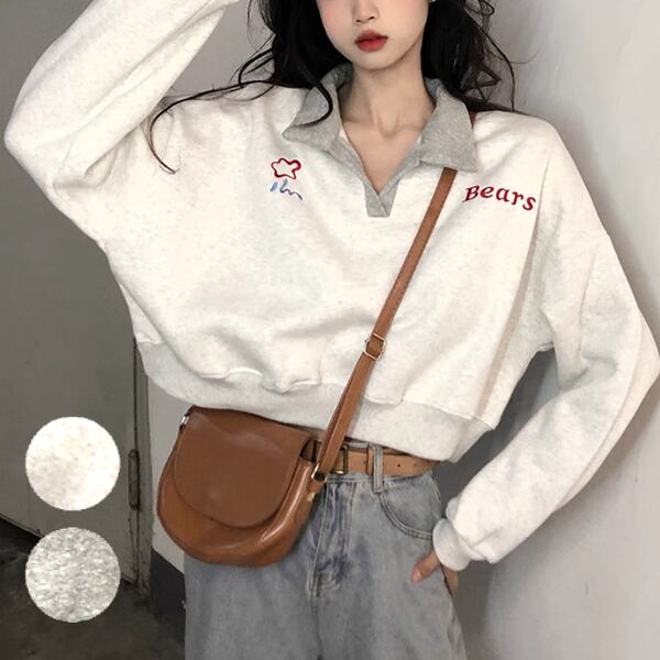 2カラー レディース トップス セーター パーカー トレーナー スウェット アウター クロップド丈 長袖 ポロカラー ストレート プラスベルベット ヘッジ フェミニン ストリート 刺繍 バイカラー 綿 かわいい シンプル カジュアル おしゃれ かっこいい レトロ スポーティー ルーズ 文字 英語 テキスト ワンポイント 秋 冬 10代 20代 通勤 通学 アウトドア キャンプ イベント ガーデン ツーリング