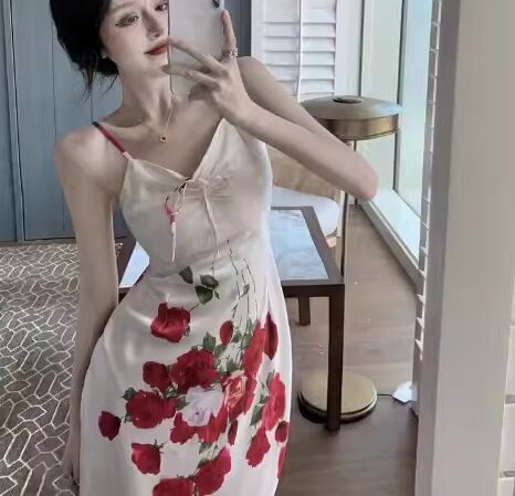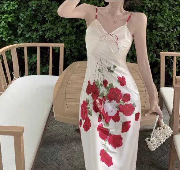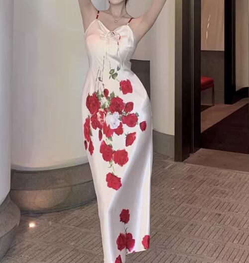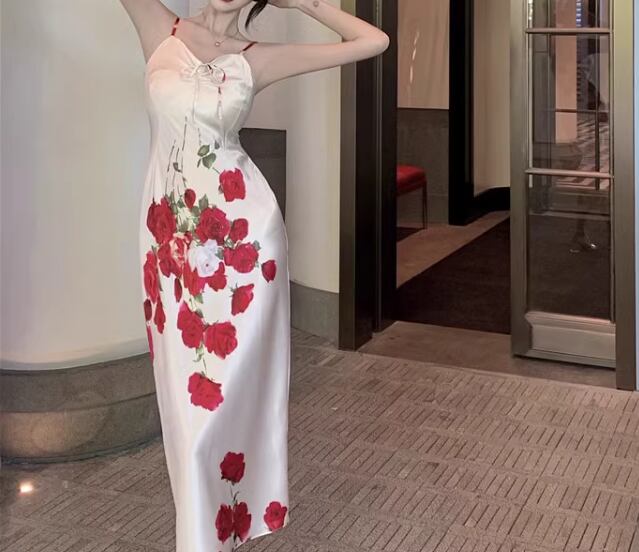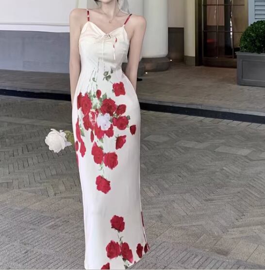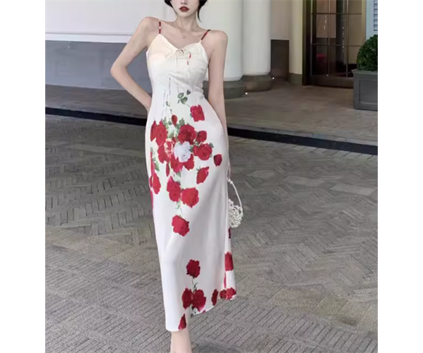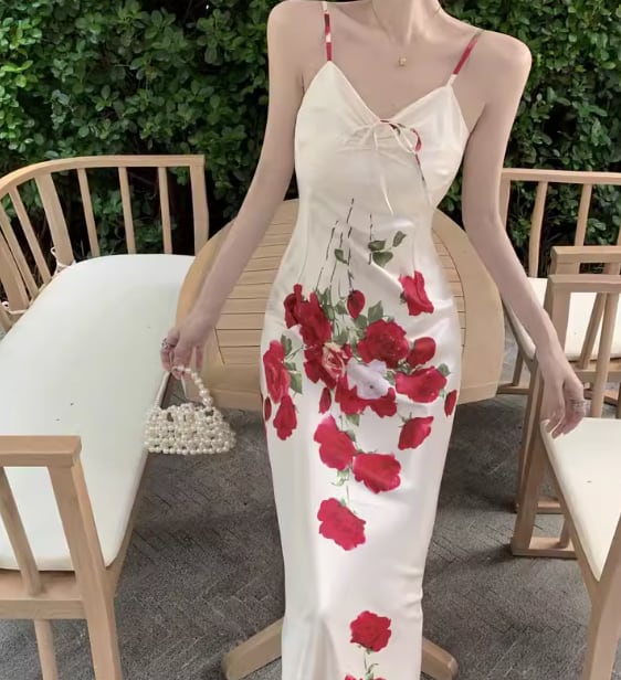 ロマンティックな花柄模様が美しいロング丈のキャミワンピース。