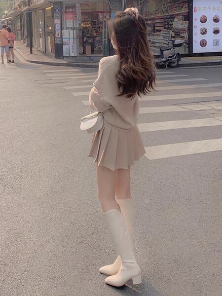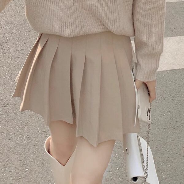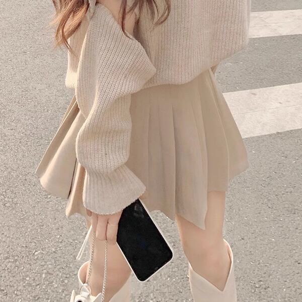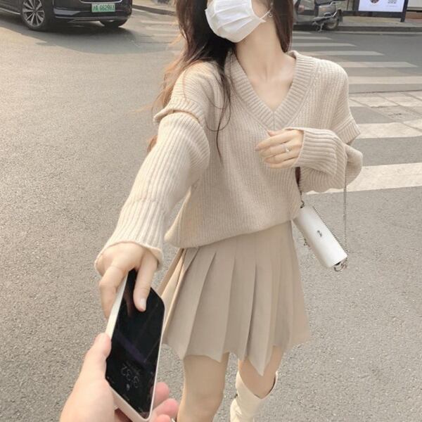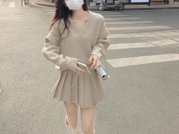 セットアップです。ミニ丈のプリーツスカートと、取り外し可能な袖が特徴のVネックセーターのコンビ。スタイリッシュな膝上のミニスカートに、ステージに応じて、袖部分を調整できるトップス。個性的なおしゃれを楽しめる機能的なアイテムです。