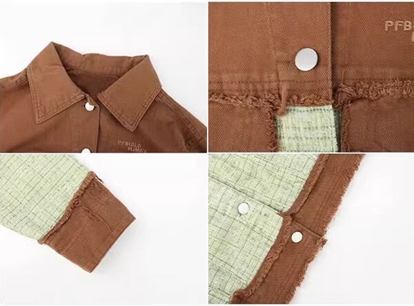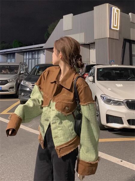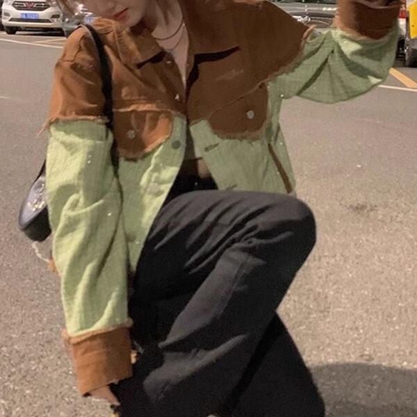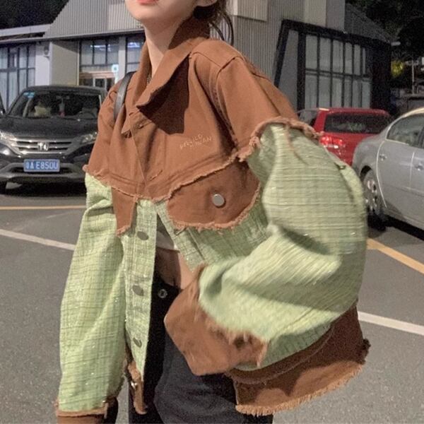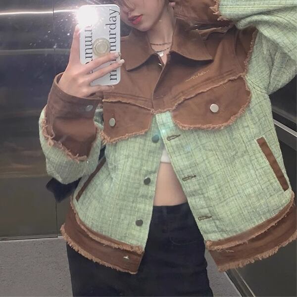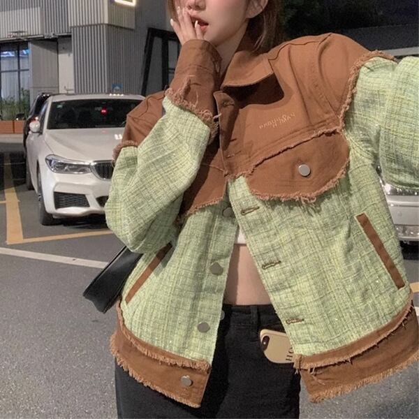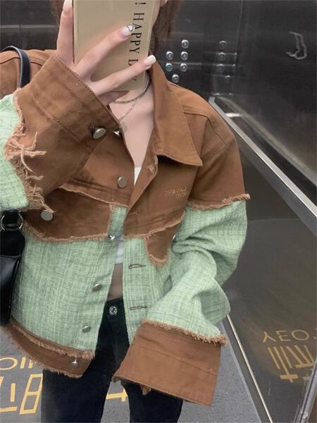 ツイード&デニム 切り替えデザインのジャケット レディース トップス ジャケット ブルゾン アウター 上着 デニムジャケット Gジャン 長袖 ポロカラー ストレート 切り替え ストリート ツイード バイカラー 配色 ステッチ フリンジ カジュアル 上品 かっこいい レトロ ルーズ 個性的 無地 秋 冬 10代 20代 通勤 通学 アウトドア イベント ライブ ツーリング 着回し インスタ映え