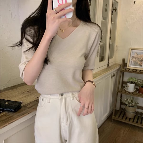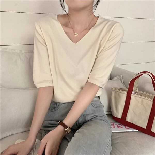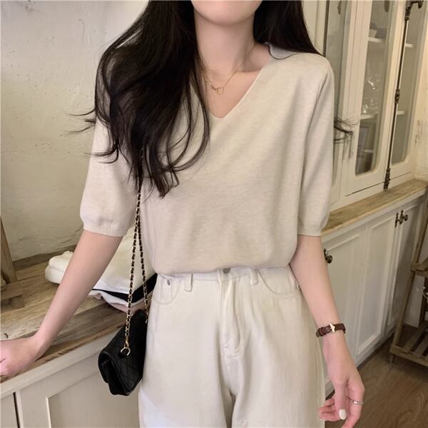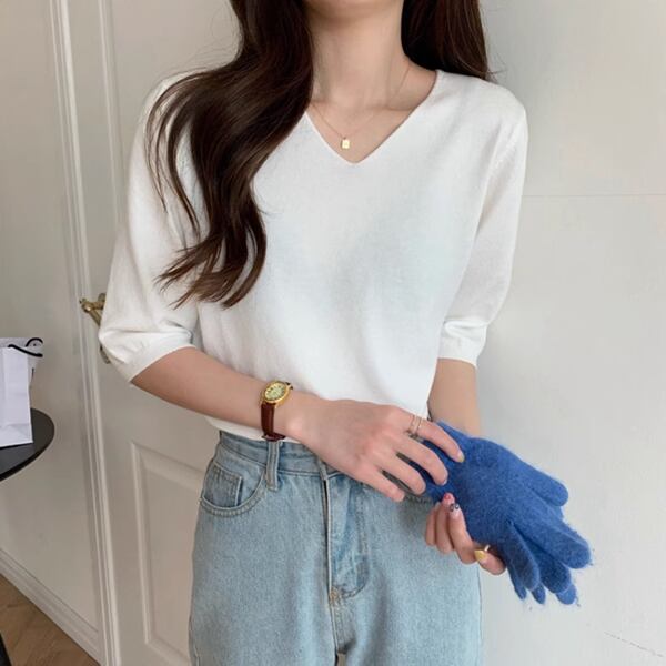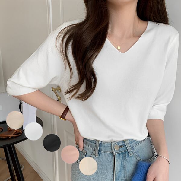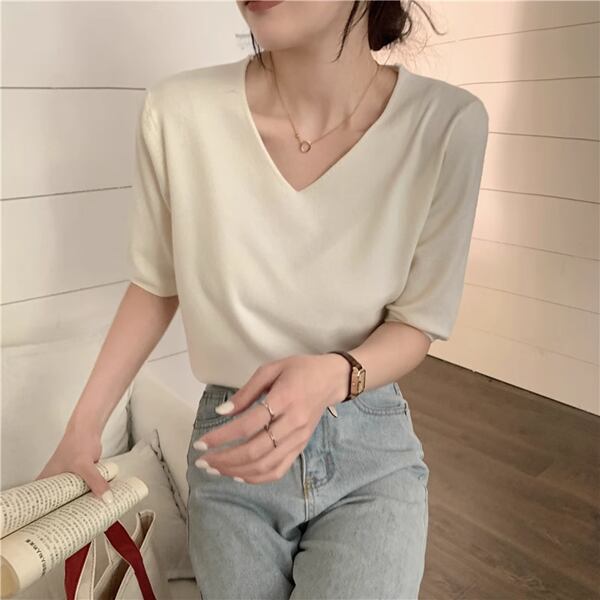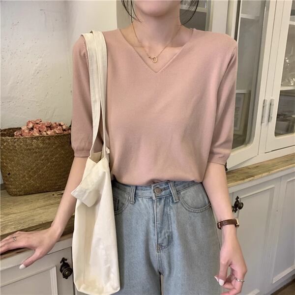 全5色 夏のアイスシルクセーター レディース トップス カットソー セーター インナー Tシャツ 5分袖 Vネック 襟なし ノーカラー ストレート 伸縮性 薄手 大人可愛い きれいめ シンプル 上品 おしゃれ レトロ ガーリー ルーズ エレガント 知的 爽やか オフィスカジュアル 無地 10代 20代 オフィス 通勤 イベント 女子会 ショッピング ライブ コンパ カフェ フリーサイズ フィット