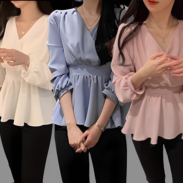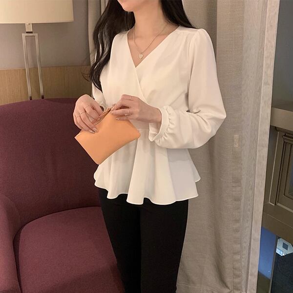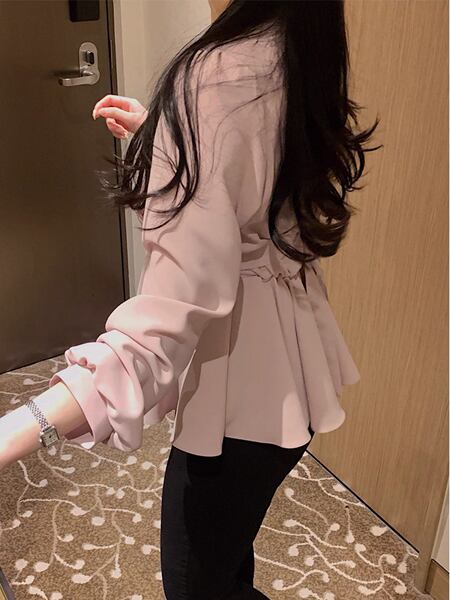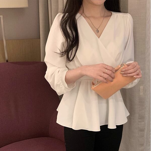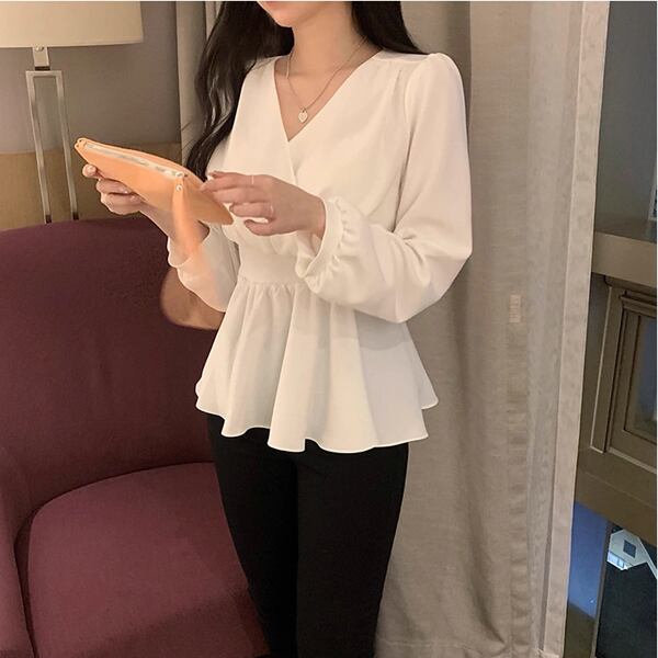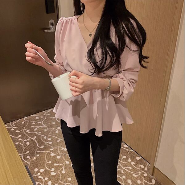 ウエストストラップ付き長袖デザインのVネックシフォンシャツ。エレガントなフリルとハイウエストが特徴。レースアップディテールが女性らしさを引き立て、洗練されたスタイルを演出します。柔らかなシフォン素材で快適な着心地も魅力です。