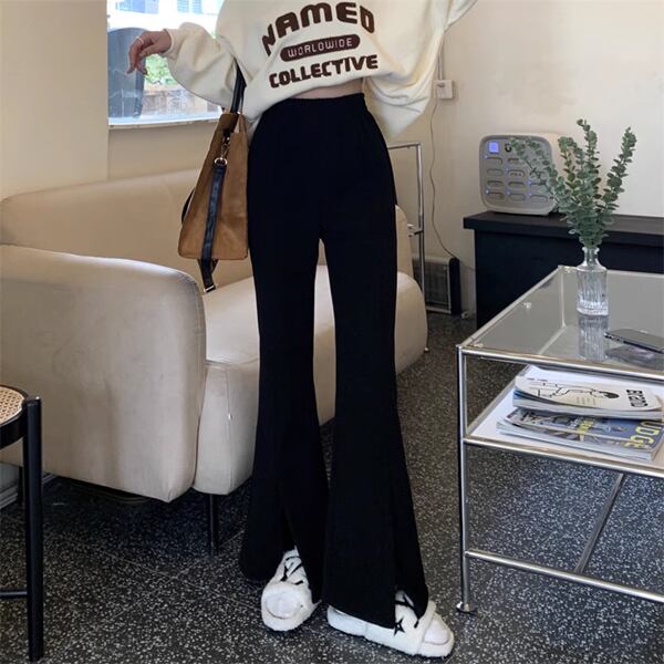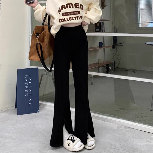 スリットマイクロフレアパンツは、上品なベルベット素材で柔らかく快適。スリットをアクセントにした、マイクロフレアシルエットで脚を美しく見せます。ハイウエストデザインでスタイルアップ効果も抜群です。