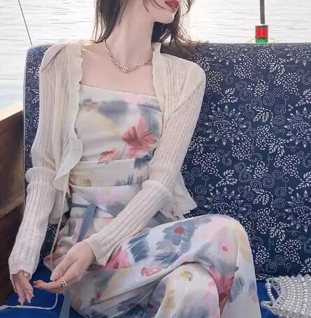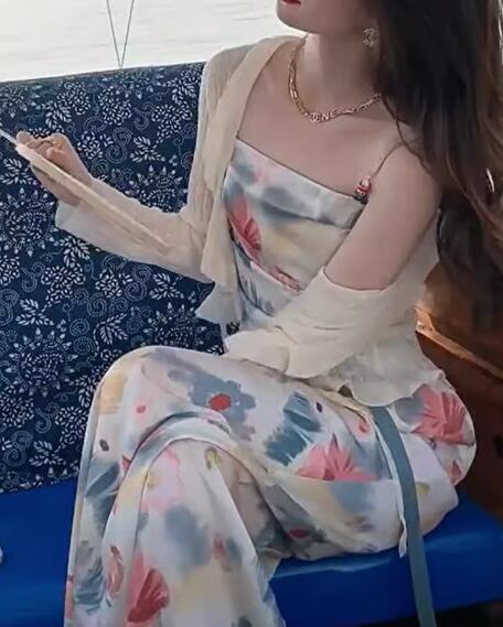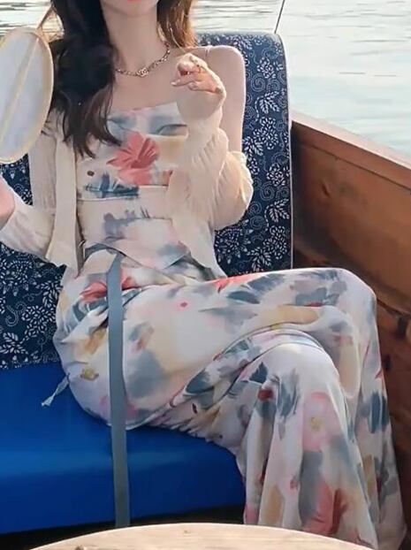 カラフルな花柄模様が美しい夏用のセットアップ。