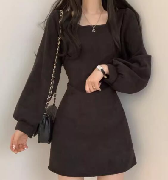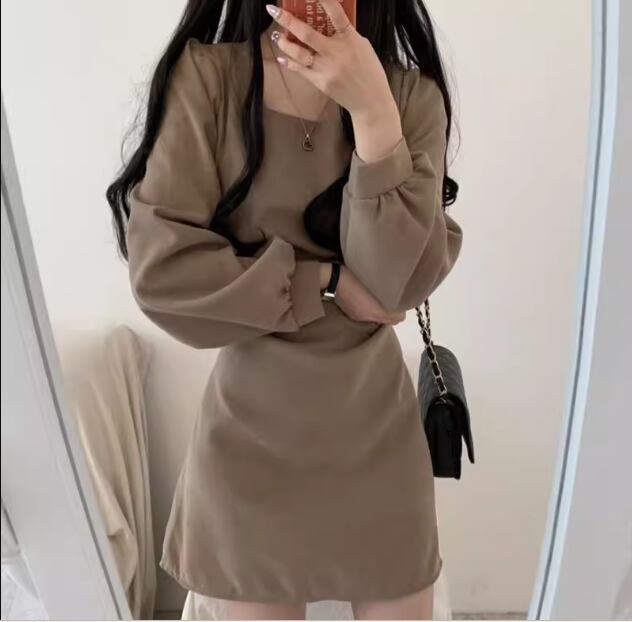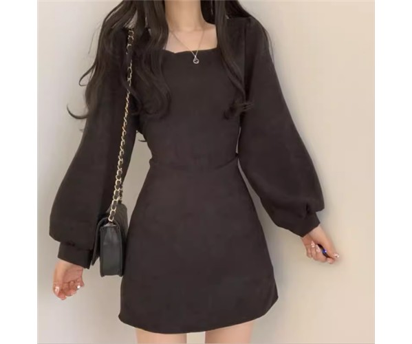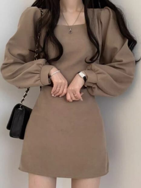 シンプルなデザインとシックなカラーが大人可愛いショート丈の長袖ワンピース。