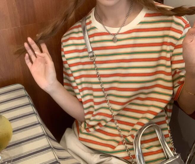 ゆったりとしたシルエットと落ち着いた色味のボーダー模様が魅力的な半袖Tシャツ。