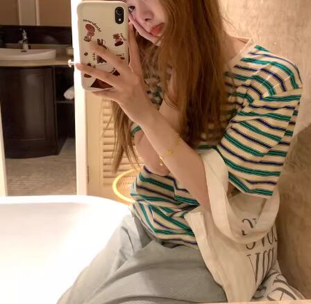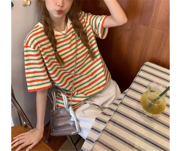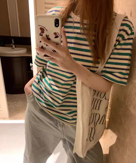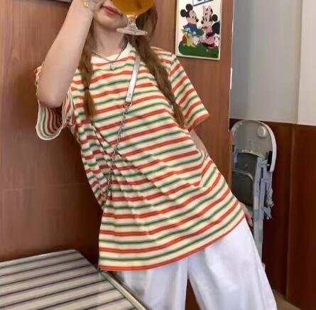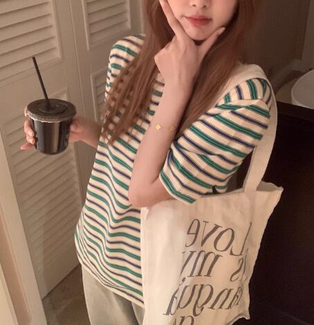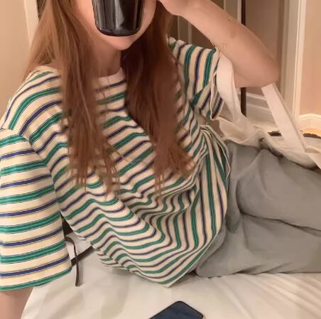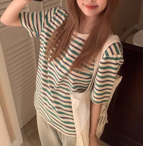 レディース トップス カットソー プルオーバー Tシャツ ミドル丈 半袖 ラウンドネック 異国風 綿 コットン かわいい 大人可愛い シンプル カジュアル おしゃれ レトロ ラフ ボーイッシュ ルーズ キュート ナチュラル リラックス シック 高級感 優しい 穏やか ボーダー 夏 デート お出かけ 韓国 体型カバー 普段使い 着回し トレンド 流行 定番 ゆったり ゆる フリーサイズ 大きめ ブルー レッド