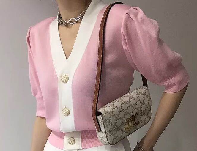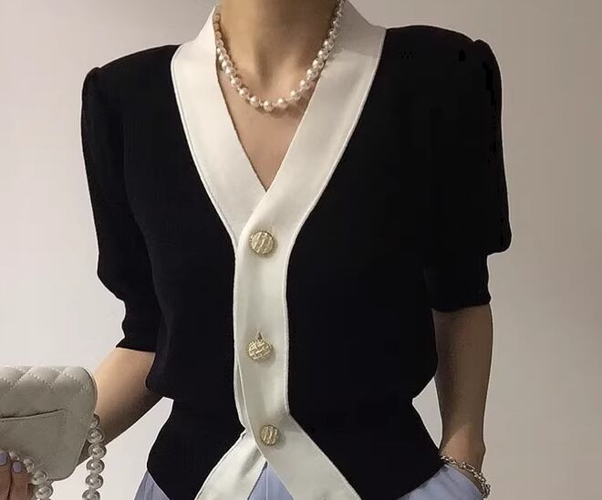 上品で落ち着いた色味とエレガントなデザインが大人可愛い半袖のサマーニット。