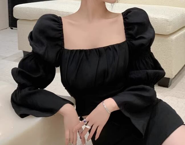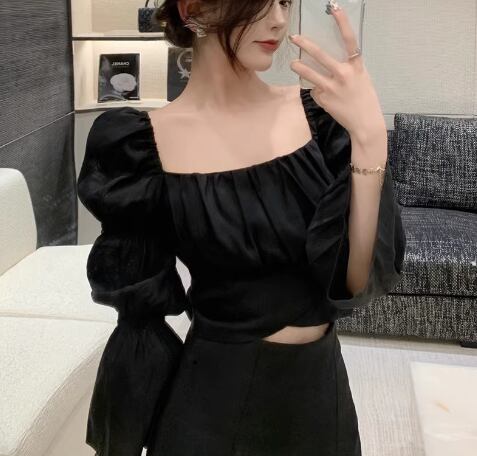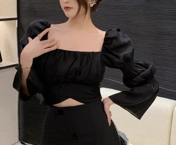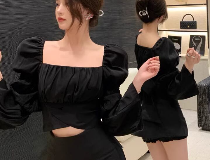 クールなブラック×深めのスクエアネックがセクシーな雰囲気のクロップド丈の長袖トップス。