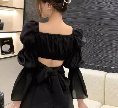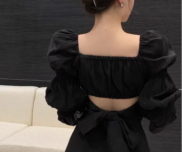 レディース トップス カットソー プルオーバー Tシャツ ショート クロップド丈 長袖 ボリューム袖 パフスリーブ ベルスリーブ スクエアネック スリム 細身 背中開き プリーツ バックリボン 異国風 かわいい 大人可愛い きれいめ シンプル カジュアル おしゃれ かっこいい こなれ感 ガーリー 個性的 クール エレガント セクシー 無地 秋 10代 20代 学生 デート お出かけ 韓国 普段使い 着回し フリーサイズ 小さめ ブラック
