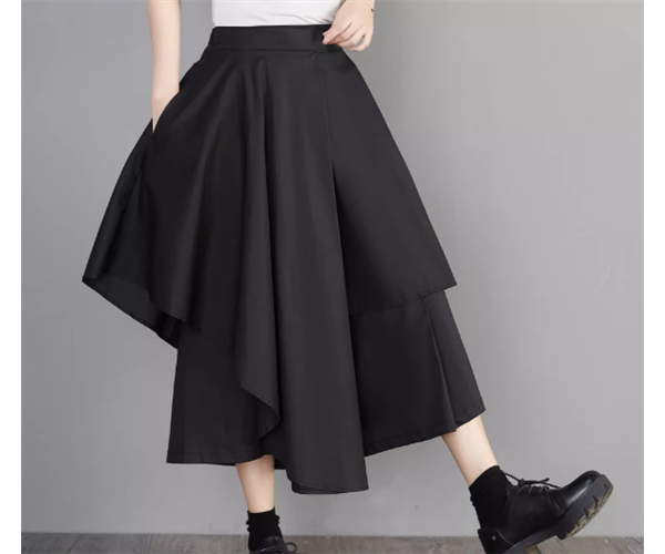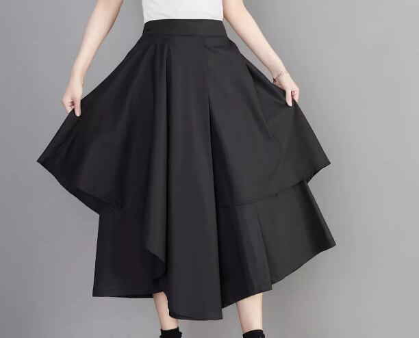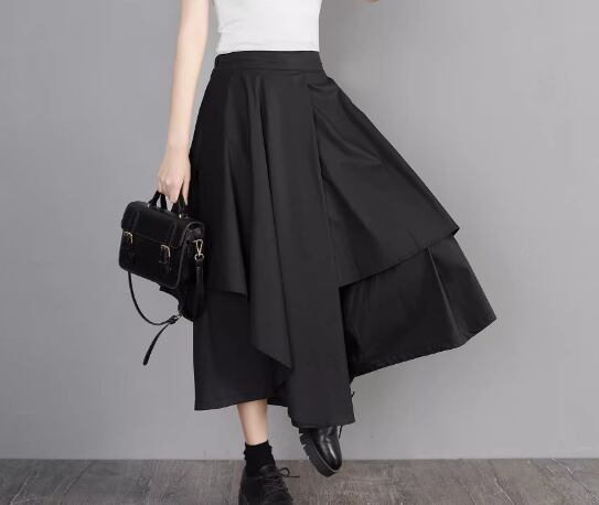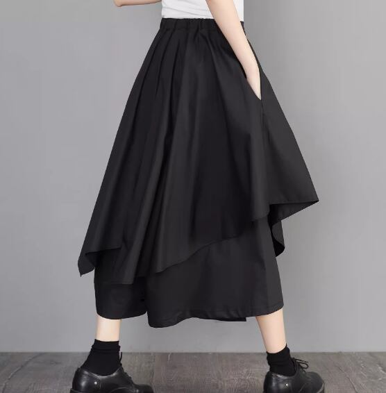 レディース スカート ミモレ ロング アシンメトリー 左右非対称 イレギュラー 不規則 Aライン フリル ハイウエスト かわいい 大人可愛い きれいめ シンプル カジュアル 上品 おしゃれ かっこいい こなれ感 個性的 クール エレガント 存在感 ゴシック ラグジュアリー 豪華 ゴスロリ ゴシックロリータ ロック シック 高級感 無地 夏 デート お出かけ 普段使い 着回し L XL 大きいサイズ ブラック