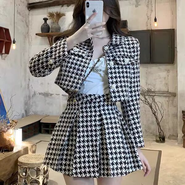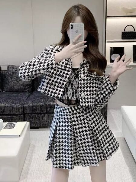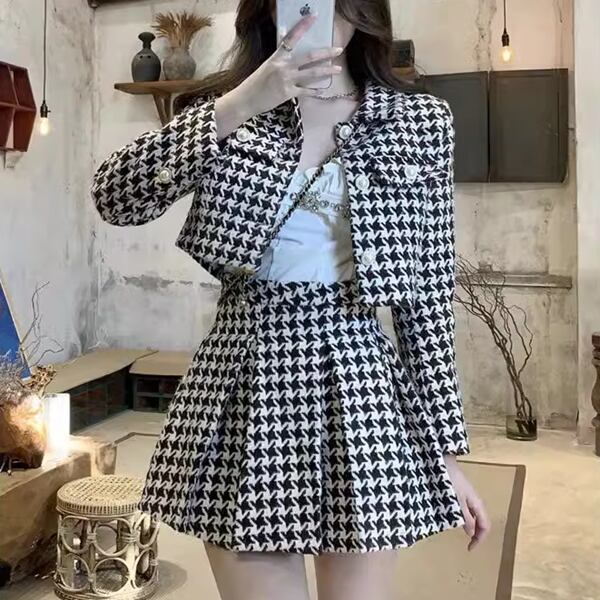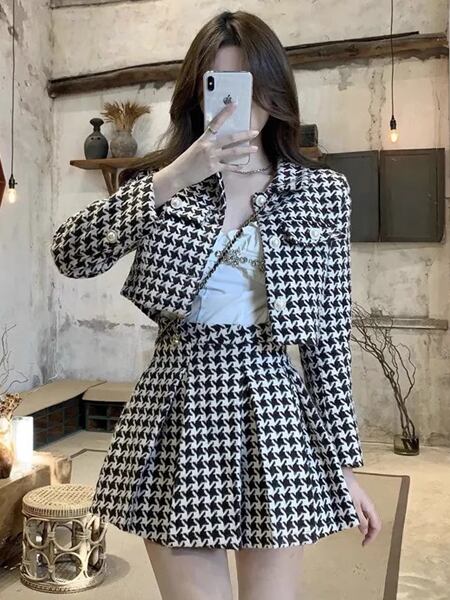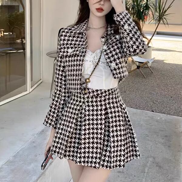 チェック柄のツーピースで、クロップド丈の長袖ジャケットとハイウエストのプリーツスカートのセットアップです。スタイリッシュでクラシック、トレンドに流されないデザインで、上品なコーディネートを楽しめます。