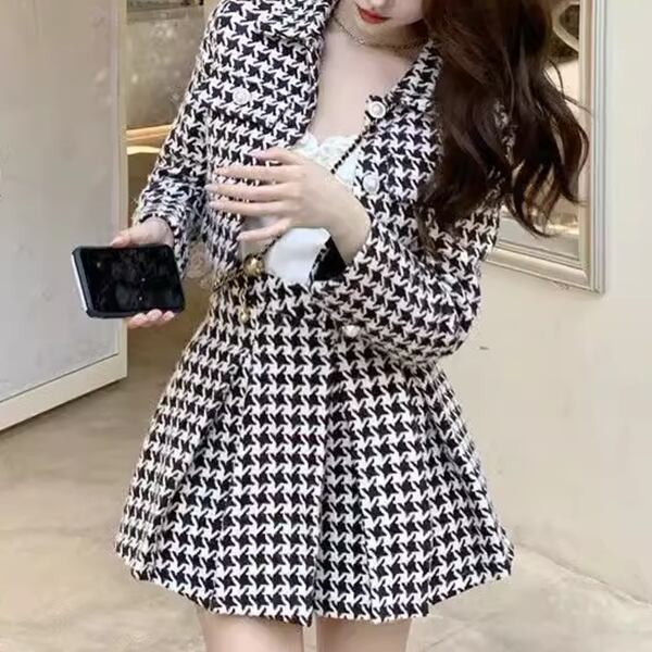 チェック柄ツーピース 二点セット 上下セット ツーピース スーツ風 レディース スカート トップス ジャケット セットアップ テーラードジャケット ブレザー プリーツスカート フレアスカート ミニスカート ミニ 長袖 ラウンドネック ステンカラー スリム Aライン プリーツ ハイウエスト ツイード バイカラー シンプル カジュアル 上品 おしゃれ エレガント フォーマル クラシカル 知的 チェック シーズンレス 10代 20代 通勤 お出かけ パーティー イベント レストラン ショッピング カフェ