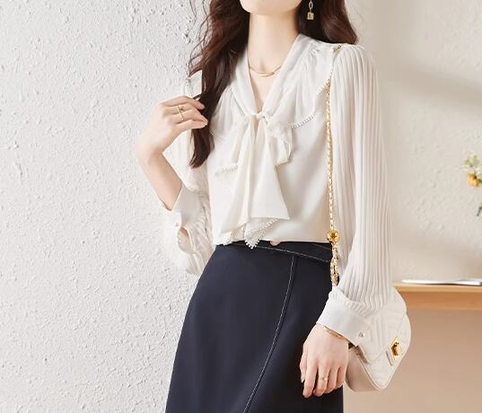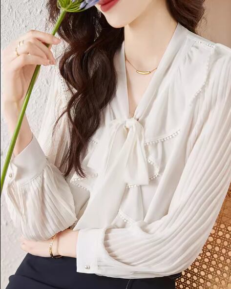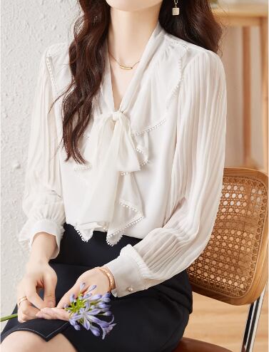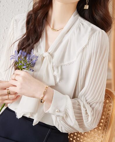上品でエレガントなデザインが魅力的な長袖のシフォンシャツ。
