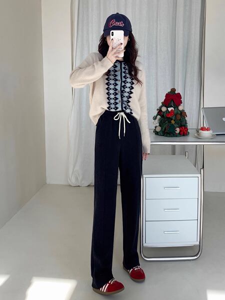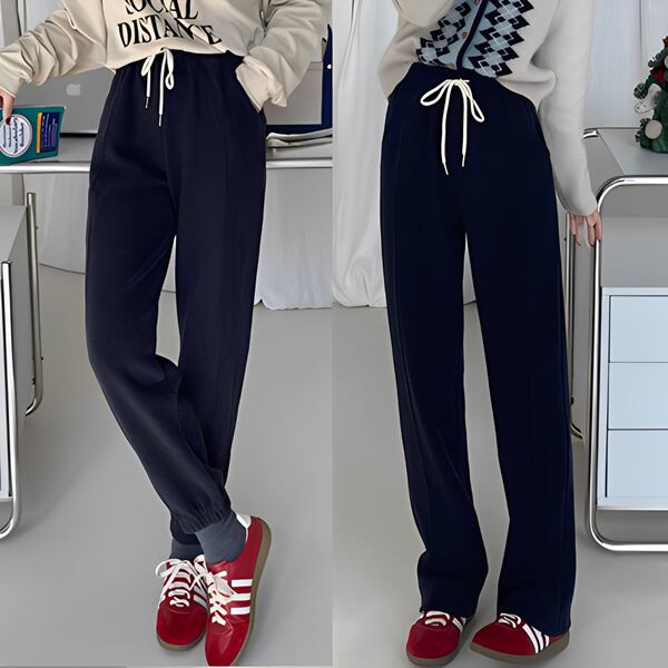 パンツを2タイプ、ご案内させていただきます。ワイドパンツとジョガーパンツです。ベルベット素材で暖かく、小柄な方にもフィットするデザインとゆったりとしたドレープ感が魅力。ハイウェストでファッション性と快適さを兼ね備えた一品。お好みのタイプをお選びください。