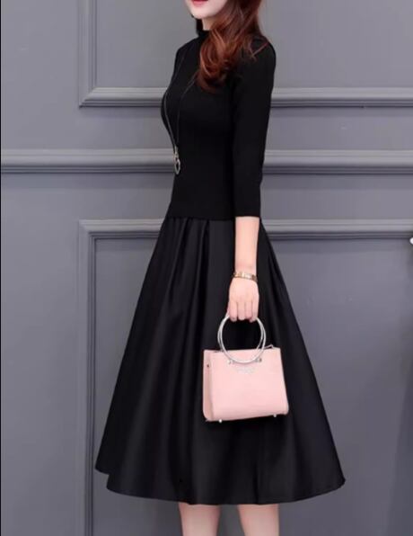 フェイクツーピース レディース ワンピース ニット プルオーバー 膝丈 ミモレ 長袖 ラウンドネック Aライン 切り替え ドッキング フェミニン フリル ポケット ハイウエスト かわいい 大人可愛い きれいめ シンプル カジュアル 上品 おしゃれ エレガント キュート ラグジュアリー ナチュラル シック 高級感 無地 秋 冬 デート お出かけ 普段使い M L XL 大きいサイズ ブラック ワインレッド