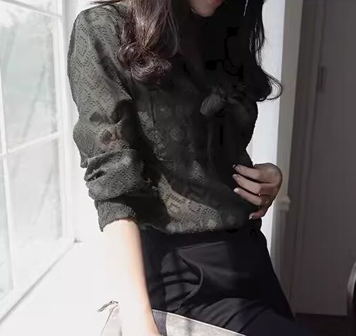 落ち着いたグリーンの色味が大人可愛い長袖のシフォンシャツ。